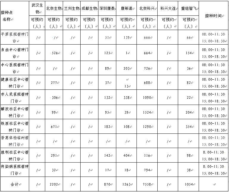 日,卫滨区新冠病毒疫苗有北京生物、兰州生物、深圳康泰、北京科兴、重组智飞、康希诺。可以现场预约名额的接种点如下: