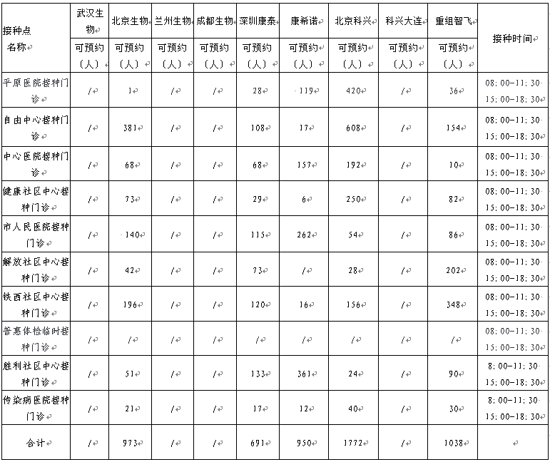日,卫滨区新冠病毒疫苗有北京生物、兰州生物、深圳康泰、北京科兴、重组智飞、康希诺。可以现场预约名额的接种点如下: