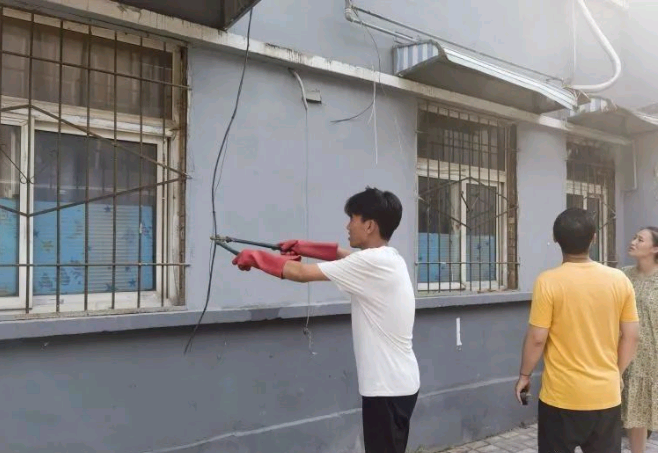 飞机场社区在东工房进行排查,发现有一处安全隐患,联合铁西街道城管科对安全隐患进行现场排除,并使用绝缘的胶带进行捆扎,消除了安全隐患。