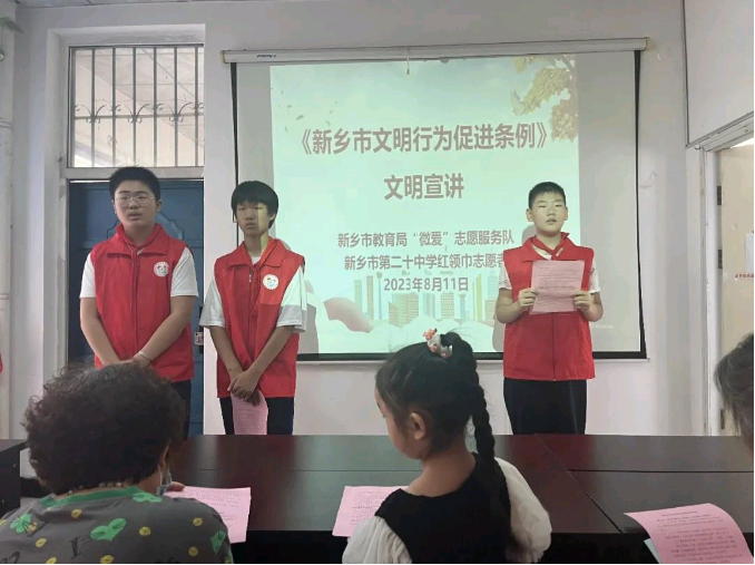 预防呼吸道传染性疾病 关爱生命健康。为进一步增强广大群众的卫生防病意识,自觉养成健康的生活方式和卫生行为习惯,提高健康素养综合水平,解放路街道联合新乡市教育局微爱志愿服务队在怡园社区开展“预防呼吸道传染性疾病”主题宣传活动,通过知识讲座向广大群众讲解呼吸道传染性疾病的危害、传播途径与预防措施。借此机会,新乡市第二十中学学生们为辖区群众带来一场《新乡市文明行为促进条例》,倡导文明行为的同时,也充分展现新时代青少年的青春活力与担当精神。