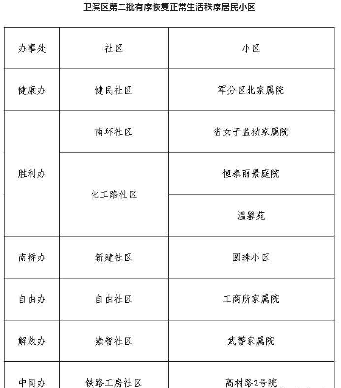 在全区居民的大力支持和积极配合下,卫滨区的疫情防控形势逐步稳定向好。根据当前疫情防控形势变化,经研究,决定分批有序恢复居民小区的正常生活秩序。现将第二批恢复正常生活秩序的小区名单及相关要求通告如下: