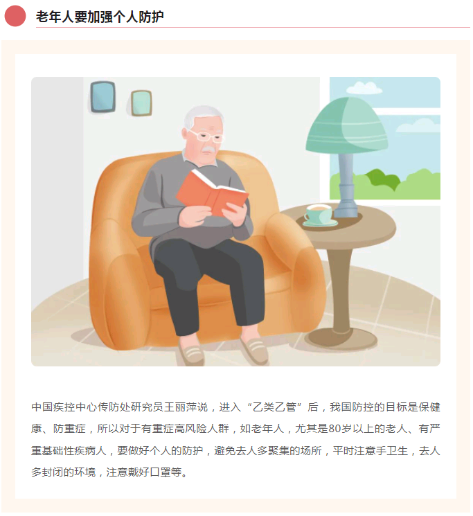 北京大学第一医院感染疾病科主任王贵强认为,原来没有感染的人群、高龄老人、没有打疫苗的人、有基础病的人,是临床高度关注的人群,也是需要重点防护的人群。这些人群应加强个人防护,预防感染。